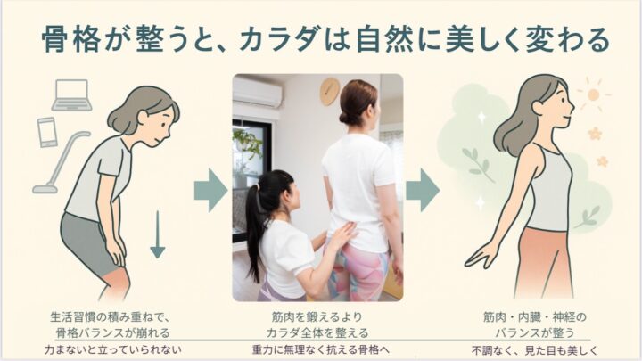 「筋肉を鍛える」よりも「骨格を整えて動きを変える」ことに重点を置き、